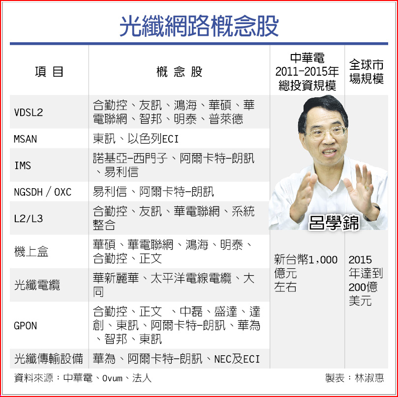 中華電(2412)昨(22)日宣布,明(2011)年投入新台幣200億元以上擴建光纖網路、最快達100Mbps上網速度,將比今年100億元倍增,同時規畫未來5年的光纖網路投資金額將高達1,000億元,其中600億元投資在用戶端傳輸設備。